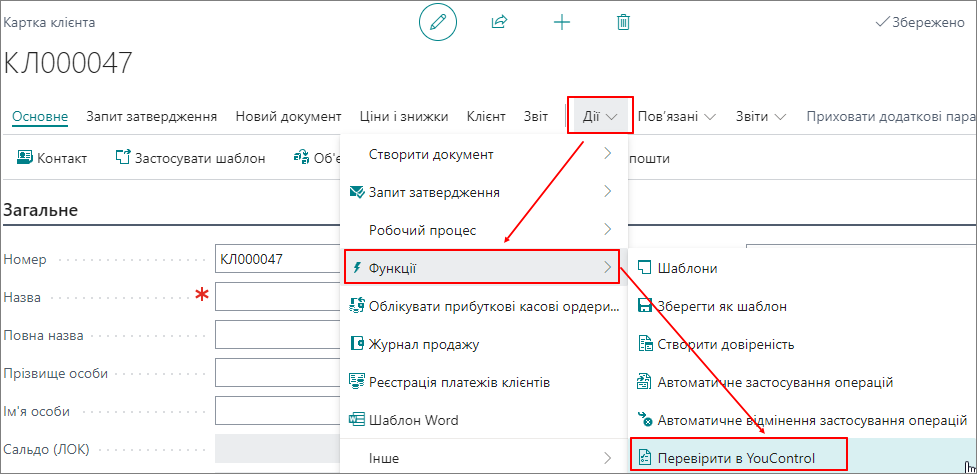 Для виконання додаткових запитів до онлайн-сервісу YouControl в «Налаштуванні інтеграції з YouControl» в полі «Вид перевірки» повинно бути встановлене значення «Ручна перевірка» та користувачеві необхідно буде натиснути на кнопки «Дії» -> «Функції» -> «Перевірити в YouControl» на сторінках Клієнтів чи Постачальників.