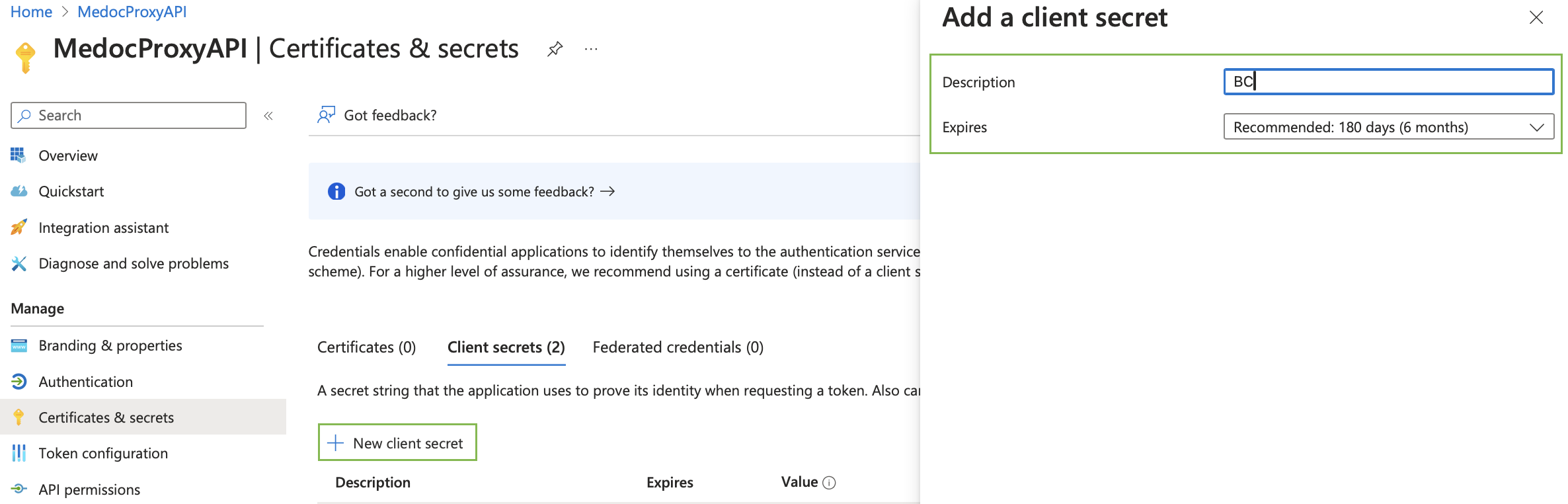 Select Certificates & secrets > New client secret from the menu. On the right, complete the fields «Description» and «Expires» , then click Add: