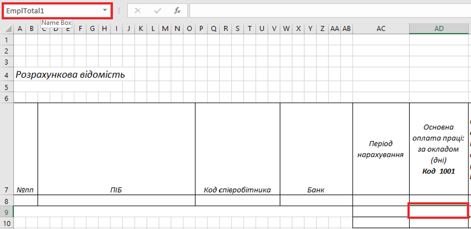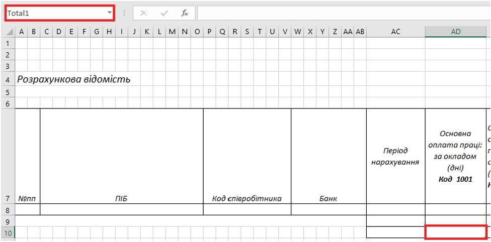 Для колонок "Нараховано", "Утримано", "До видачі", які рахуються автоматично за налаштуванням "Підсумковий Код". У шаблоні ці комірки повинні мати назви: TypeTotals1, TypeTotals2, TypeTotals3 – для рядка з нарахуванням; EmplTypeTotals1, EmplTypeTotals2, EmplTypeTotals3 – для підсумкового рядка по співробітнику; TypeTotalsGlob1, TypeTotalsGlob2, TypeTotalsGlob3 – для загального підсумкового рядка.
